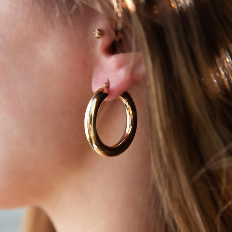 Bu 14 ayar altın halka küpe, zarafetin ve klasik şıklığın mükemmel bir örneği. Daire formundaki tasarımı, her açıdan göz alıcı bir ışıltı sunarak, stilinize sofistike bir dokunuş katıyor.