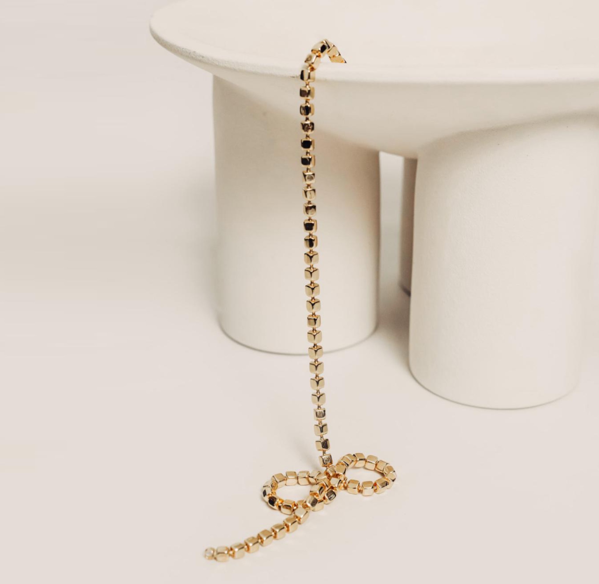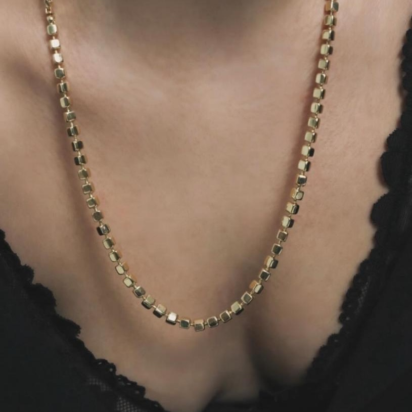 Geometrik zarafetin ışıltıyla buluştuğu altın küp zincir kolyeler, stilinde net çizgilerden ve güçlü detaylardan vazgeçmeyenler için tasarlandı. Her bir küp formu, modernliği simgelerken altının eşsiz ışıltısıyla birleşerek etkileyici bir duruş yaratır.